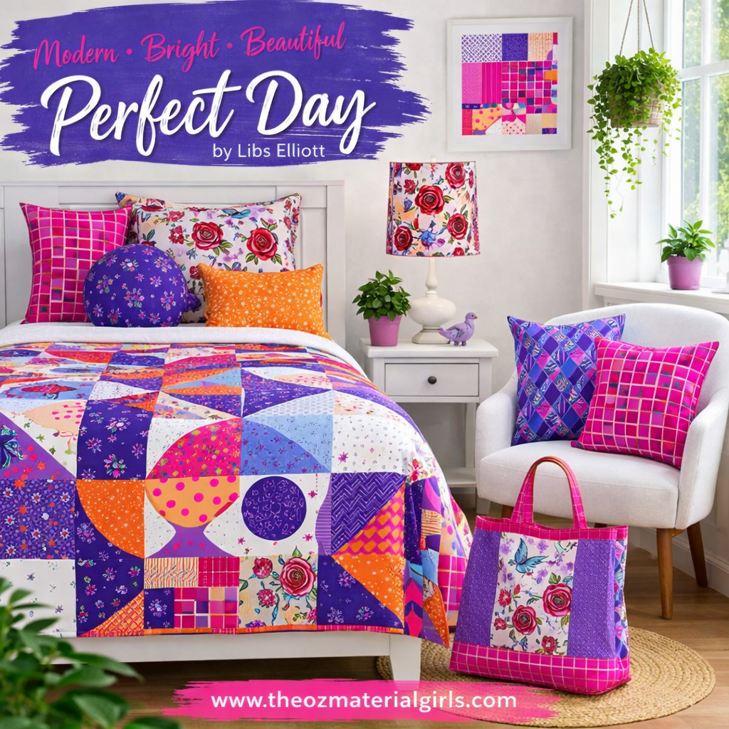 A vibrant and playful 1/2 metre fabric bundle from the Perfect Day collection, featuring a stunning mix of bold geometrics, delicate florals and coordinating prints in rich pinks, purples and soft neutrals. Perfect for quilting, bag making, garments and creative sewing projects, this bundle offers a beautifully balanced colour palette with striking contrast and detail.