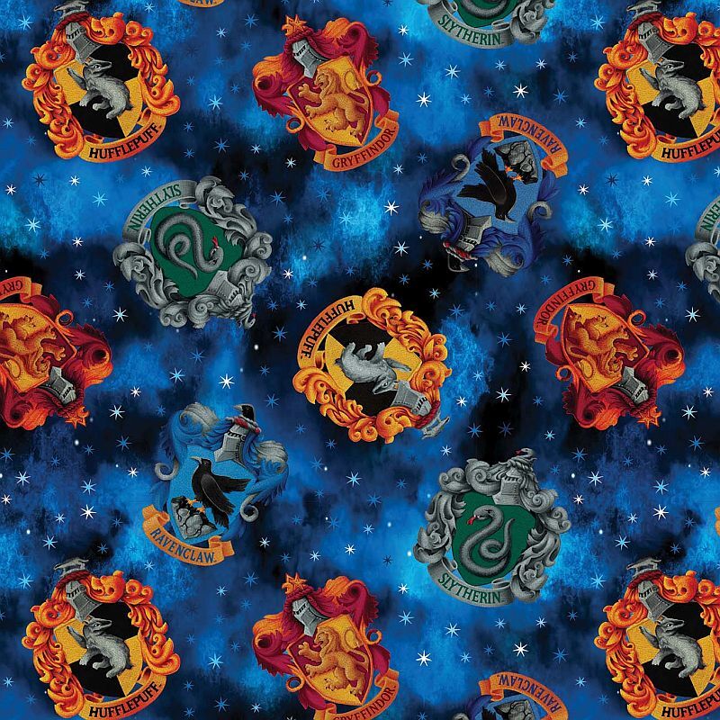 Celebrate Hogwarts pride with House Crests Blue from the Harry Potter collection by Benartex. This vibrant print features the iconic crests of Gryffindor, Slytherin, Ravenclaw and Hufflepuff floating across a rich, starry blue background. Perfect for Harry Potter quilts, themed projects and fan sewing, this design makes a striking feature fabric or focal print.