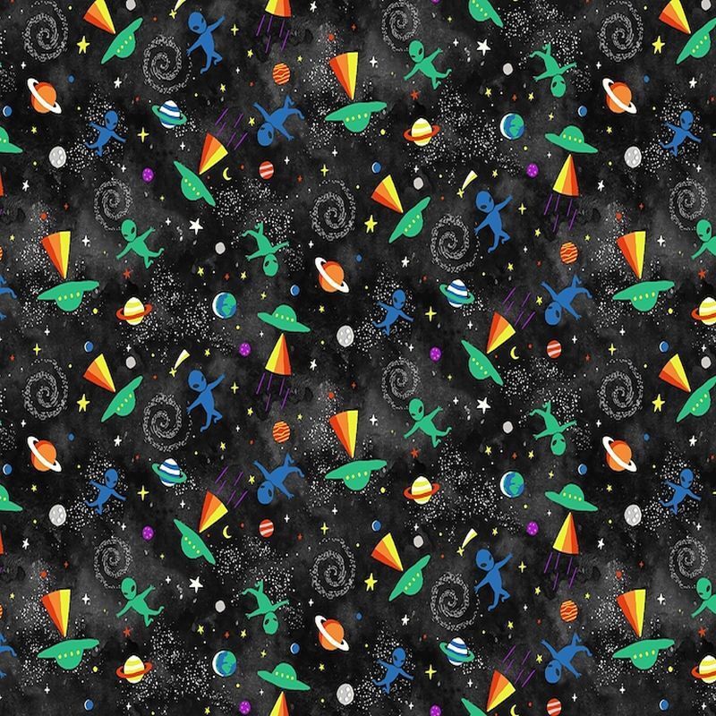 Blast Off Tossed Aliens And Ufos Black by Timeless Treasures