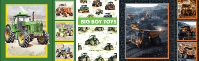 Big Boys Toys by Devonstone is a fun, bold fabric collection featuring tractors, diggers, dump trucks and farm machinery in detailed illustrated prints. Ideal for kids’ quilts, cushions, pillowcases, bags and themed décor, these premium cotton fabrics are perfect for fussy cutting and feature blocks. A great choice for little farmers and construction lovers alike.