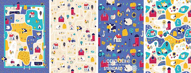 Pasture Bedtime is a cheerful, modern farm-themed collection by Devonstone, filled with adorable cows, sheep, chickens, barns, tractors and colourful countryside scenes. The palette blends sunny yellows, soft creams, rich blues and fun pops of red — perfect for children’s quilts, nursery décor, clothing, play mats and accessories.