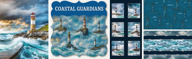 The Coastal Guardians fabric collection by Henry Glass and City Art Studio offers an evocative seaside vibe with lighthouse motifs, nautical instruments, ocean waves, stormy-sky backgrounds, rope and border stripe accents. Great for coastal-themed quilts, cabin décor, beach-house pillows, bags, baby nursery décor, and coastal home accessories. The range includes allover lighthouse prints, stormy ocean fabrics, nautical tools motifs, border stripes and panels — ideal for patchwork, sashing, borders, feature blocks and coordinated sewing projects. Available in 100% cotton, suitable for quilting, craft, apparel, and home décor. Explore Coastal Guardians for timeless coastal charm and quality craftsmanship.
