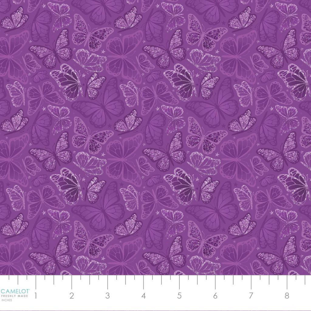 Disco Queen Fabric Collection by Camelot Fabrics. A versatile tonal print featuring butterflies with soft shimmer effects on purple. A perfect coordinate for quilts, bags and apparel.