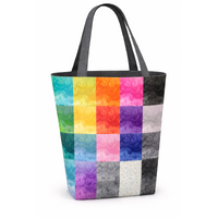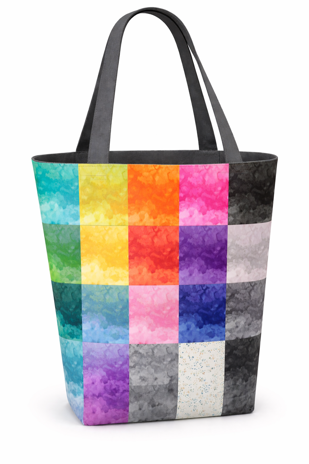 Crafted from the Misty Rainbow Colour Stories palette, this vibrant patchwork tote showcases a joyful rainbow gradient with painterly texture detail. Designed with the Patchwork Tote Magic Prompt layout, it features: