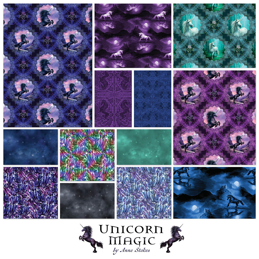 From the Unicorn Magic collection by Anne Stokes for Clothworks, a beautifully curated fat quarter bundle featuring 15 coordinating designs in a mix of unicorn scenes, crystals, stars, and ornate textures—perfect for quilts, patchwork projects, and building a magical fabric stash.