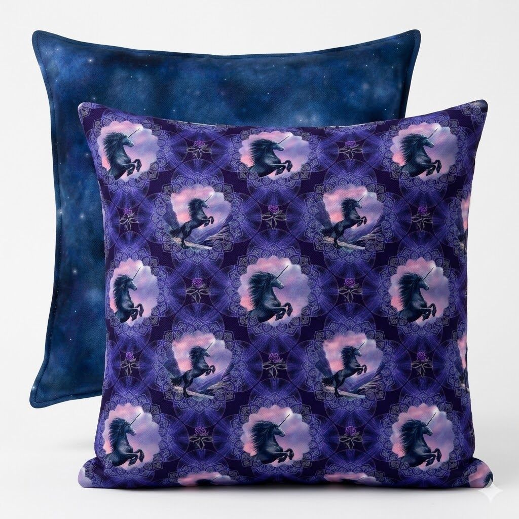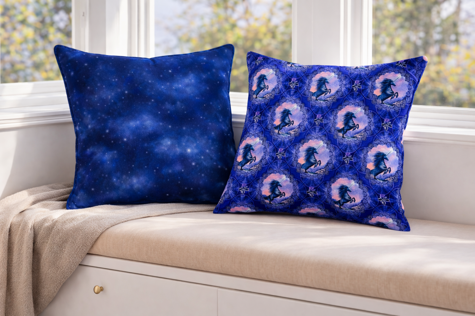 Add a touch of magic to your space with this stunning Unicorn Magic Cushion Pillow Set by Clothworks, featuring a dreamy deep blue galaxy print paired with a whimsical unicorn design in rich purple tones. Perfect for brightening up bedrooms, sewing rooms or cosy reading nooks, this coordinating set brings fantasy and colour together beautifully while showcasing detailed, high-quality printed fabric designs inspired by the Unicorn Magic range.
