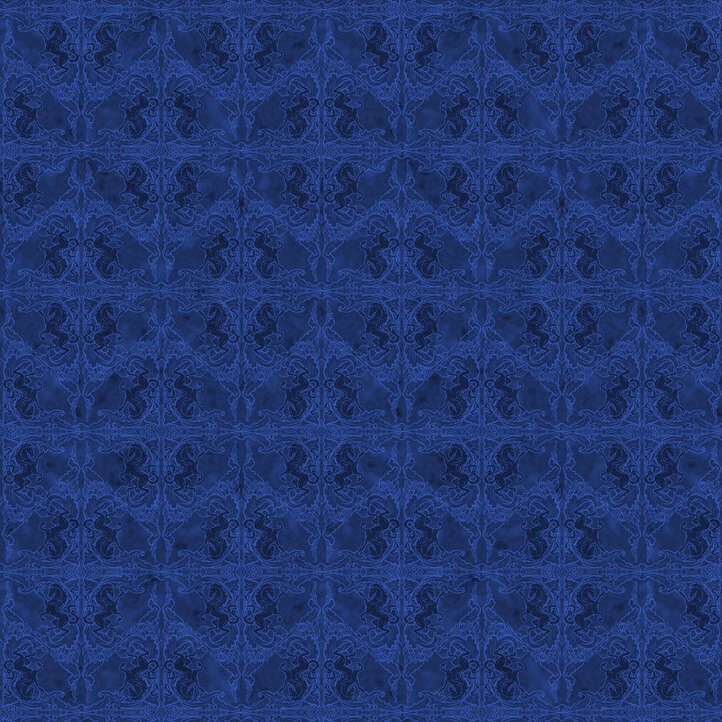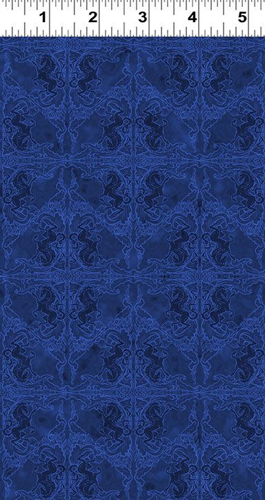 From the Unicorn Magic collection by Anne Stokes for Clothworks, a rich blue fabric featuring an intricate digital coat of arms design with ornate, symmetrical detailing and a soft tonal background—perfect for adding depth, elegance, and a magical gothic touch to quilts, borders, and sewing projects.