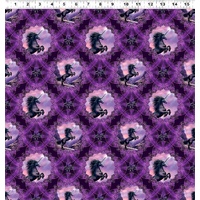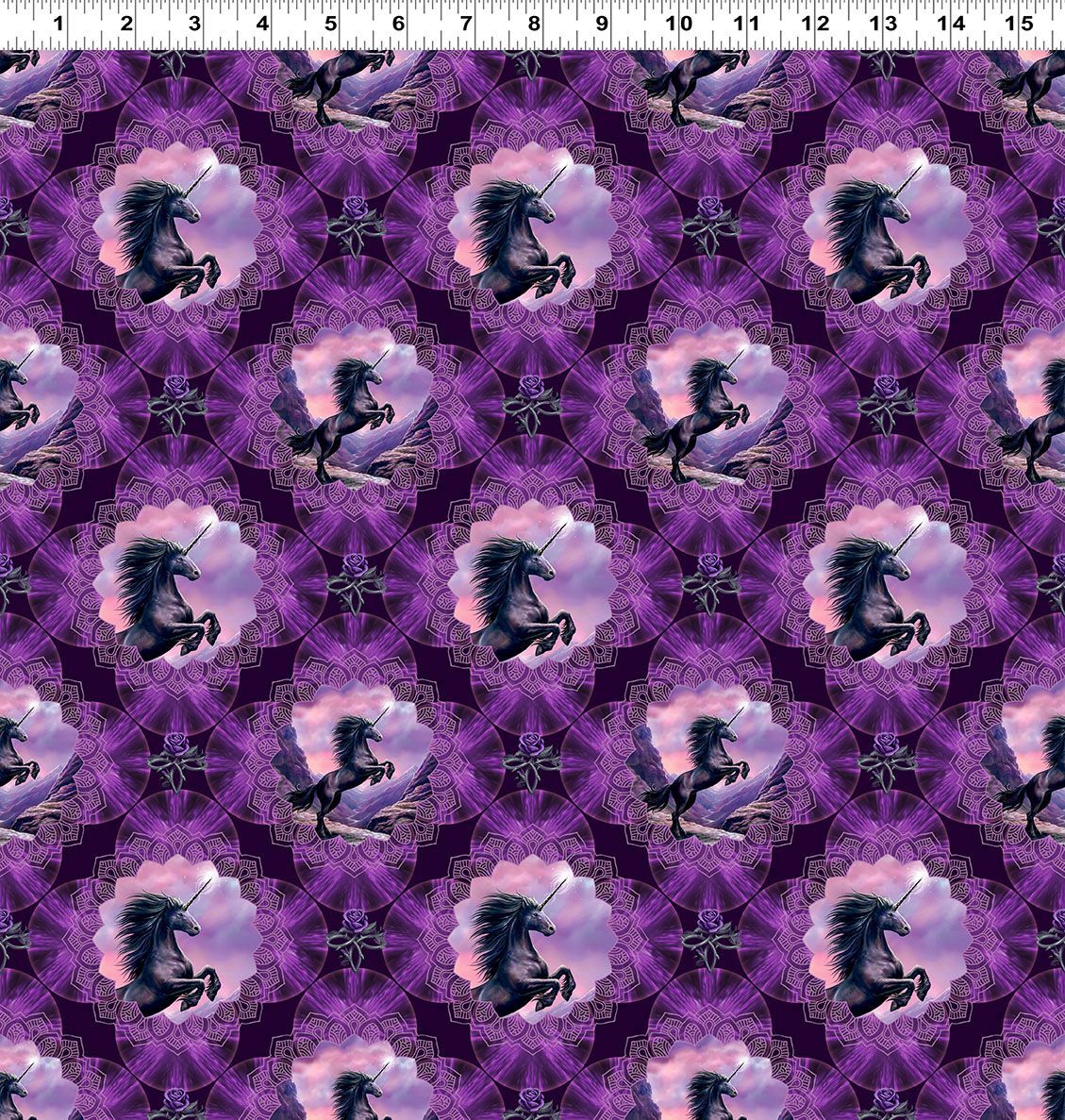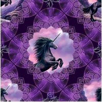 From the Unicorn Magic collection by Anne Stokes for Clothworks, a rich eggplant fabric featuring beautifully framed unicorn portraits set within ornate digital medallions, surrounded by intricate detailing and soft tonal textures—perfect for feature quilts, fussy cutting, and magical themed sewing projects.