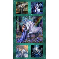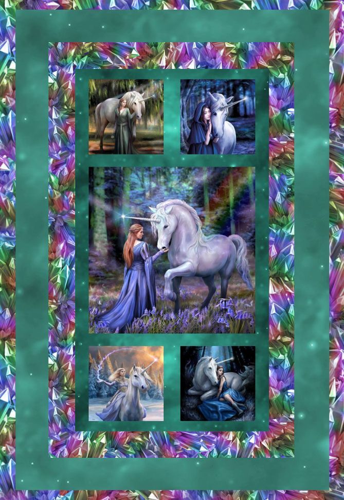 Create a stunning feature quilt with the Unicorn Magic Quilt Kit by Anne Stokes for Clothworks, showcasing a beautiful unicorn panel framed with coordinating crystal and tonal fabrics in rich green tones—perfect for adding a magical statement to your sewing projects.