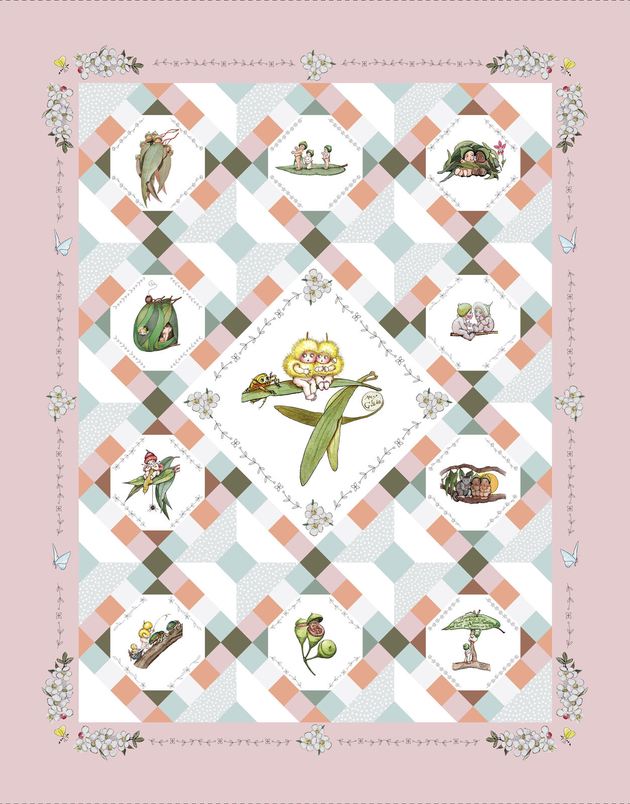 May Gibbs – Garden Playtime by Devonstone Collection  – A charming feature fabric panel framed with a soft  pink border, filled with gumnut babies, blossoms and native florals. Perfect for quilts, wall hangings, cushions, nursery décor and children’s bedroom accents.