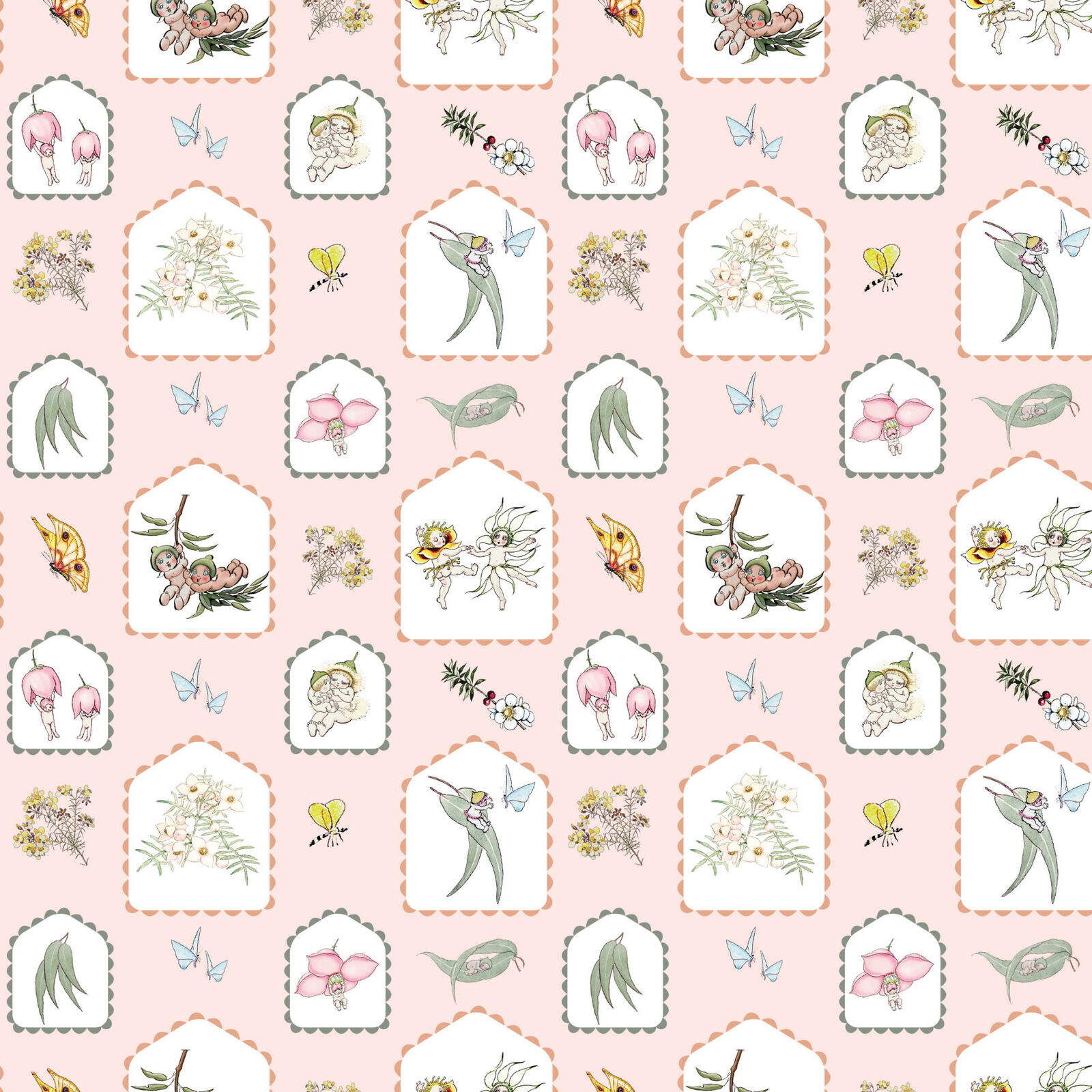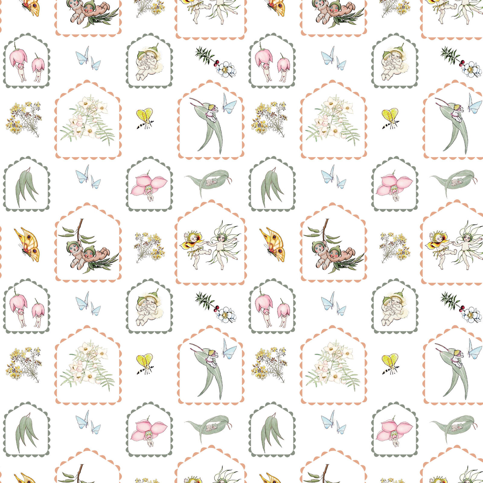 May Gibbs – Garden Playtime by Devonstone Collection –. This beautiful bundle includes every print from the cotton range in a convenient pre-cut format, perfect for quilting, patchwork, children’s sewing, nursery décor, accessories and gift making. Featuring gumnut babies, native florals, gingham checks, hexies, scatter prints and coordinating blenders in soft pastel tones. An ideal set for scrappy quilts, fussy cutting, small projects and colour-coordinated sewing.
