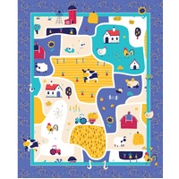 A playful cot-sized farm quilt panel featuring barns, tractors, animals and rolling countryside scenes arranged in a bold framed layout. Perfect as a quilt centre, wall hanging, playmat top or nursery feature. Printed on premium 100% cotton with vibrant detail.