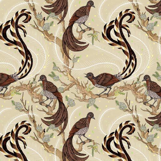 Fabric Remnant | Australian Wonderful Wings Lyrebirds Beige (82cm x 112cm)