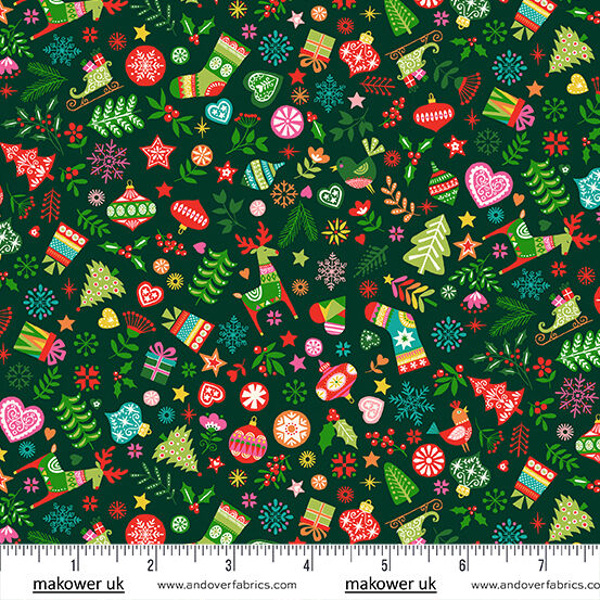 Fabric Remnant | Christmas Brights Scattered Ornaments Green (53cm x 112cm)