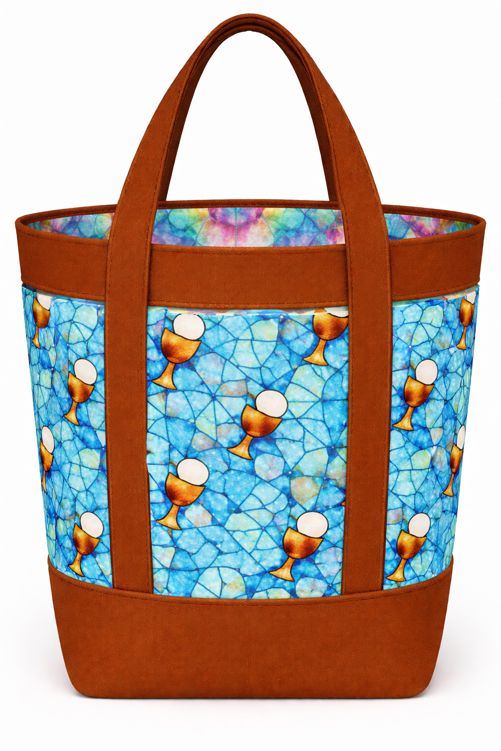 Create a meaningful faith-inspired tote with this Faith in Full Color Grocery Bag Kit featuring the Chalice print by City Art Studio for Henry Glass. Beautiful stained glass style chalices set on a vibrant blue mosaic background create a striking design, paired with coordinating fabrics for the handles, base and lining. A lovely sewing project for church groups, gifts or everyday use.