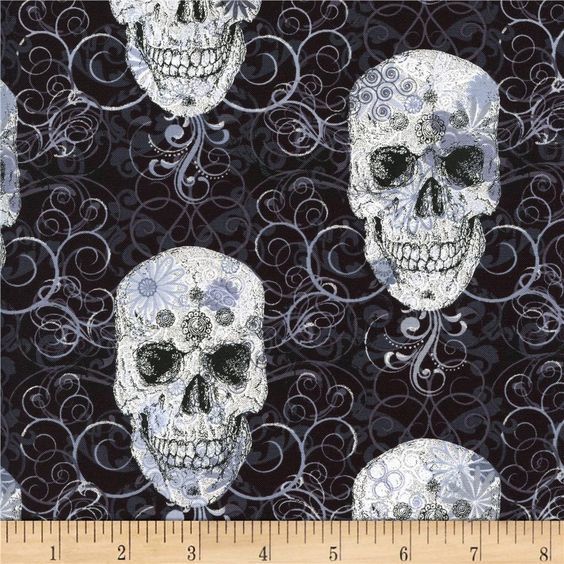 Flourish Sugar Skulls fabric by Timeless Treasures features metallic white skulls on black