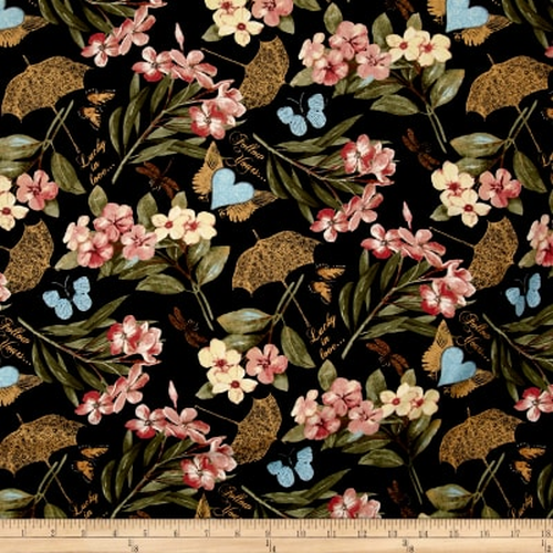 Garden Hideaway quilt fabric by Wilmington features butterflies , umbrellas and flowers on black