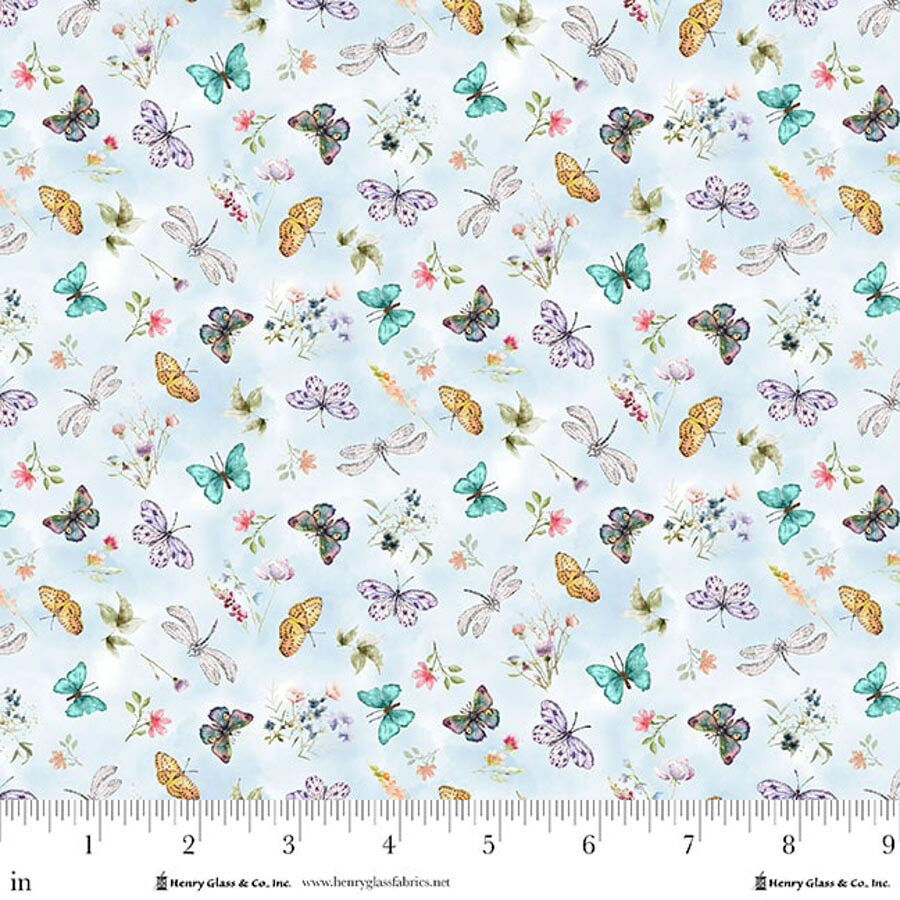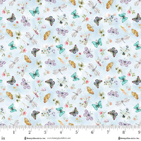 Add gentle movement and charm to your next project with Butterfly & Dragonfly Toss Blue from the Basket Full of Blessings collection by Henry Glass.This delicate print features scattered butterflies, dragonflies and tiny florals floating across a soft blue background. The airy palette of lavender, aqua, golden yellow and blush creates a beautifully balanced coordinating fabric that pairs effortlessly with the feature bunny prints and plaids in the range.Perfect for quilt borders, backing, blenders, children’s projects and seasonal décor, this versatile print brings lightness and harmony to any design.