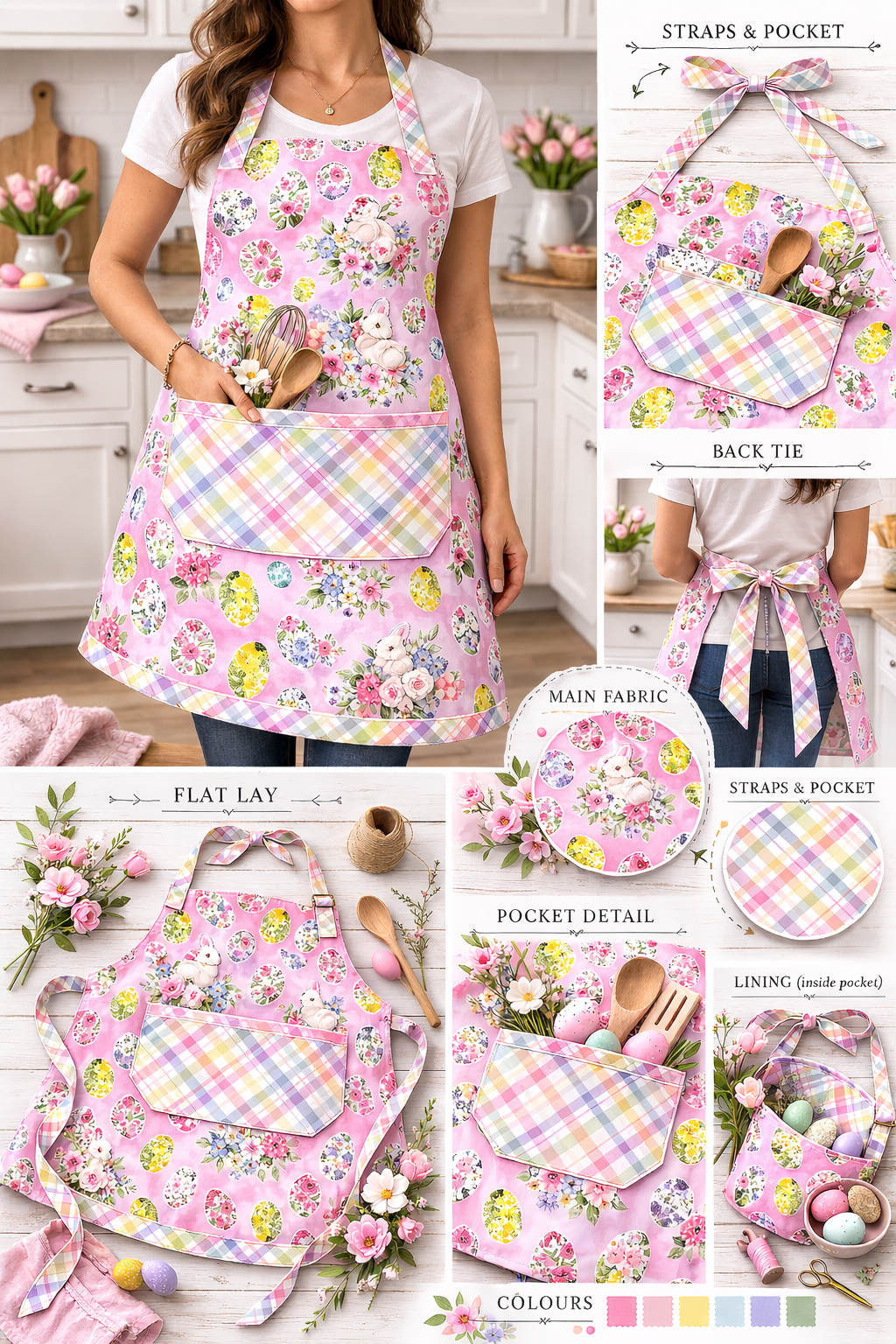 Sew something charming and practical with this Bunny Floral Apron Kit featuring Basket Full of Blessings by Catherine Bartolli for Henry Glass. This beautifully coordinated apron pairs the soft Easter Egg Pink as the main fabric with the coordinating plaid for the pocket and ties, creating a sweet seasonal design perfect for baking, crafting or gifting.Ideal for Easter entertaining, handmade gifts or adding a touch of spring to your kitchen, this coordinated kit makes sewing simple and satisfying.