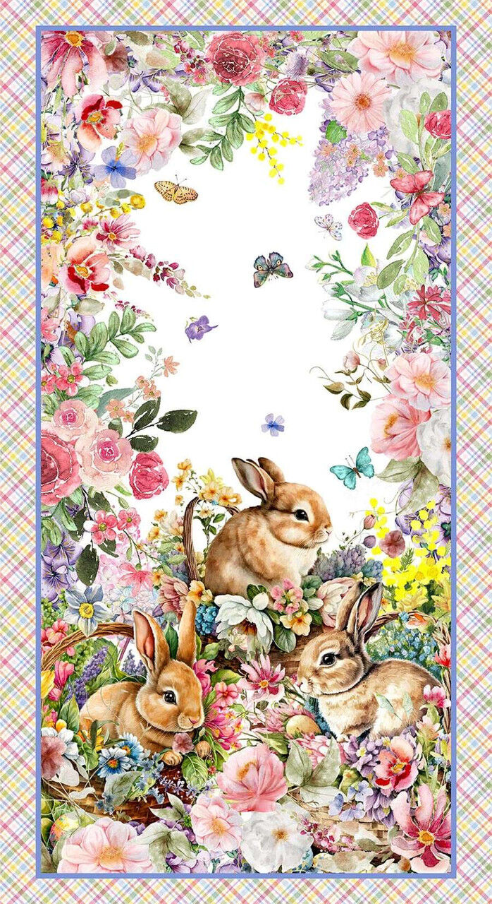 Create a breathtaking centrepiece with the Floral Bunny Scenic Panel Multi from the Basket Full of Blessings collection by Henry Glass. This stunning full panel features beautifully illustrated bunnies nestled among abundant florals, butterflies and delicate garden details, framed with a coordinating pastel plaid border that perfectly complements the rest of the collection. Ideal for a quick quilt, wall hanging, nursery décor or statement project, this panel captures the soft pastel palette and storybook elegance of the range while pairing seamlessly with the coordinating florals, plaids and stripes for borders and sashing.