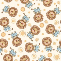 Boho Buddies by Henry Glass Fabrics – Lions on cream. This soft quilting cotton features whimsical lions in overalls with suns and stars, ideal for quilts, kids’ projects and décor.