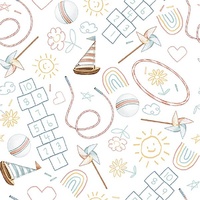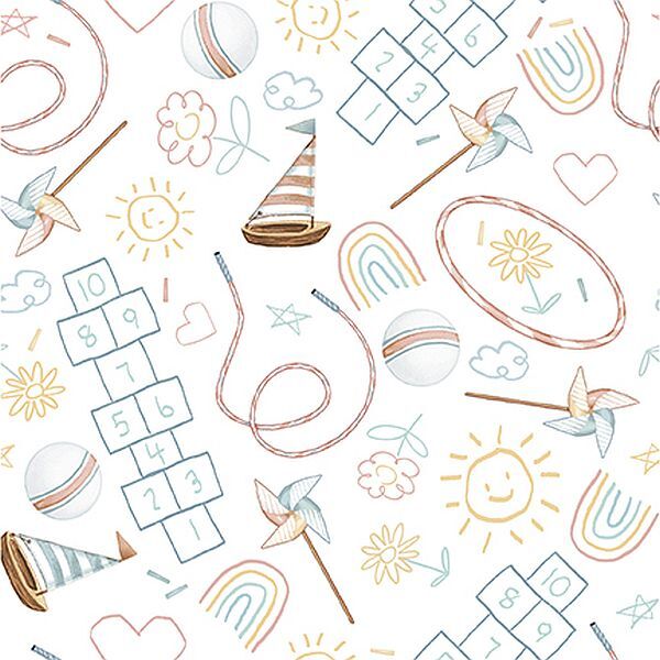 Boho Buddies by Henry Glass Fabrics – Playful sketch on white. A fun doodle-style quilting cotton with toys, games, and rainbows, perfect for kids’ projects.