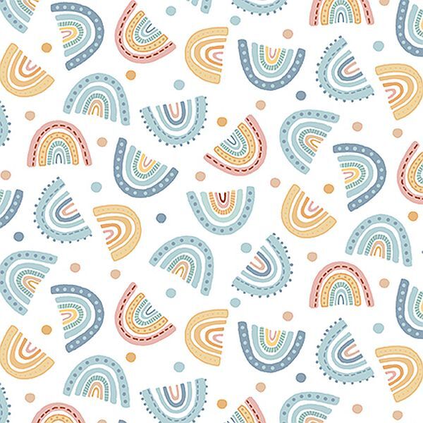 Boho Buddies by Henry Glass Fabrics – Rainbows on white. A bright and cheerful quilting cotton, perfect for patchwork, modern nursery décor, and gifts
