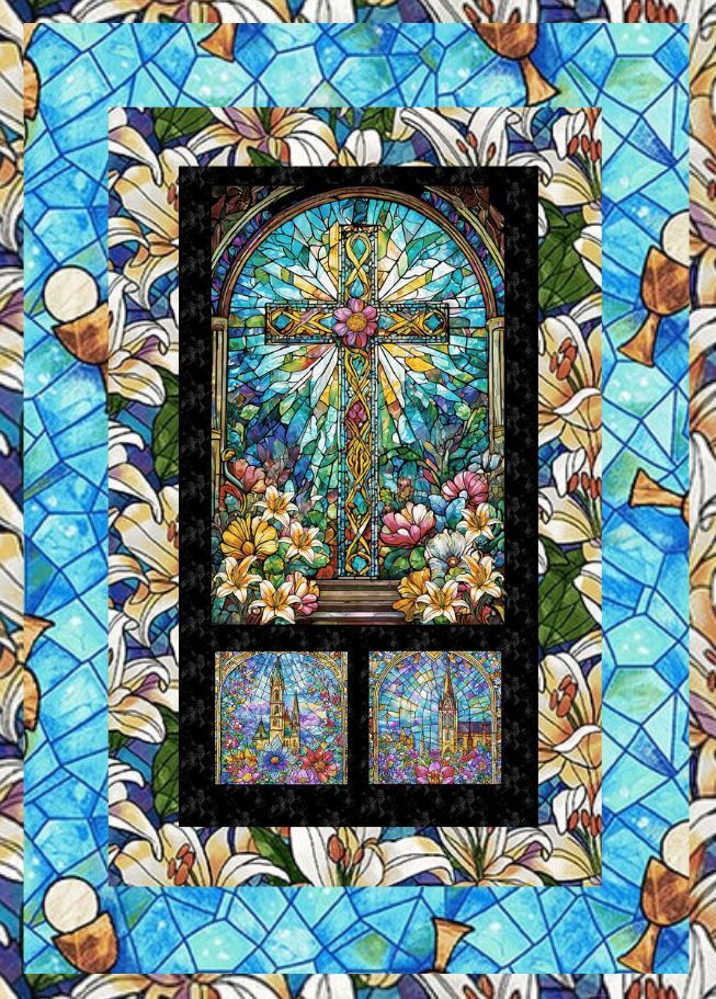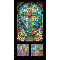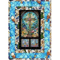 Church Cross Quilt Kit from Faith in Full Color by City Art Studio for Henry Glass features the striking stained glass cross window panel surrounded by coordinating prints from the collection. The radiant turquoise stained glass fabrics and floral accents create a beautiful faith-inspired quilt design. Perfect for devotional quilts, church displays or meaningful handmade gifts, this kit brings together the symbolic artwork and vibrant cathedral colours of the collection in one stunning project.