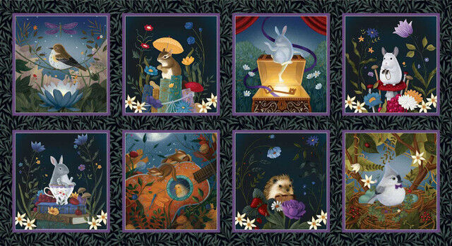 The Continuous Blocks Navy 24" panel from the Serenade collection by Henry Glass features beautifully illustrated woodland scenes arranged in repeating framed blocks across a rich navy background. Each block showcases detailed animals, florals and musical elements, creating ready-made focal squares perfect for quilt centres, cushion fronts or feature panels within a larger layout. The continuous format allows you to cut individual blocks or combine multiple panels for expanded designs, giving flexibility for creative quilt planning. Digitally printed for exceptional clarity and depth, this premium quilting cotton captures every fine line and colour nuance, bringing the Serenade woodland world to life in each framed scene.
