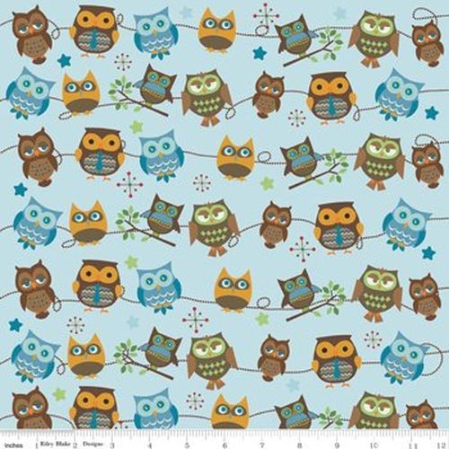 Hooty Hoot returns flannel fabric by Riley Blake features owls on sky blue