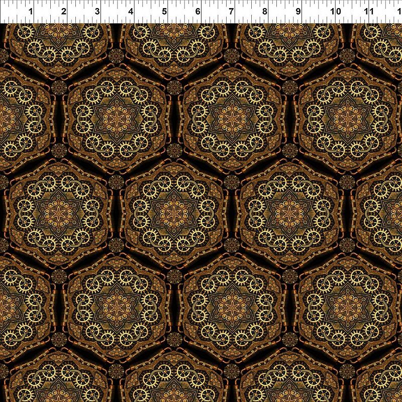 Steampunk Digital by Janson Yenter for In the Beginning Fabrics. This design is an intricate hexagon medallions built from gears, scrollwork and metallic filigree in deep gold and bronze. Ideal for English paper piecing, borders, fussy cutting, bags and striking quilt blocks. large quilt pieces.
