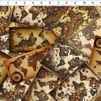 Steampunk Digital by Janson Yenter for In the Beginning Fabrics. An all-over collage of antique-style maps overlaid with gears, compasses and steampunk machinery. Perfect for travel quilts, journal covers, bags, borders and masculine projects.