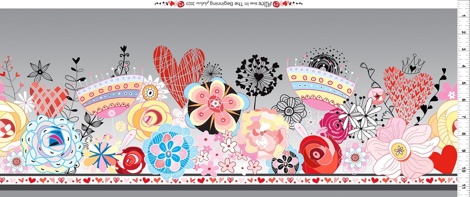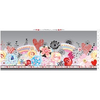 Alice Fabric Collection by Janson Yenter for In the Beginning Fabrics.A striking vertical border stripe featuring layered florals, hearts, and folk-style motifs set against a soft grey ground. Border Stripe Grey is perfect for quilt borders, statement bag panels, table runners, and feature pieces where direction and impact matter. This print captures the playful storytelling style of the Alice collection and adds instant drama to any project.