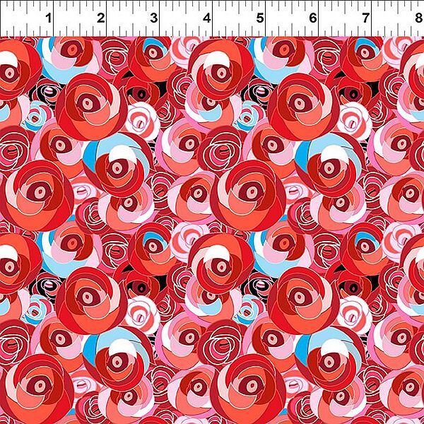 Alice Fabric Collection by Janson Yenter for In the Beginning Fabrics. A dramatic all-over rose print bursting with layered petals in vibrant reds, pinks and soft aqua accents. Roses Red is a striking feature fabric, perfect for statement quilts, borders, bags and bold backings.