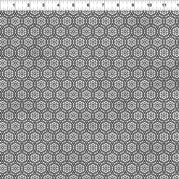 Celestial Web Ivory from the La Luna collection by Jason Yenter features an elegant black geometric lattice layered across a soft ivory background. Delicate circular motifs and fine linework create a refined, almost constellation-like structure that feels both modern and timeless. This versatile coordinate works beautifully as a quilt background, subtle blender, or sophisticated border print. It balances the dramatic moon panels and rich navy tones in the collection while adding light, contrast, and intricate detail.