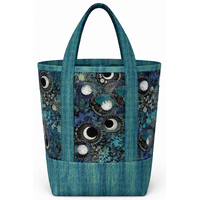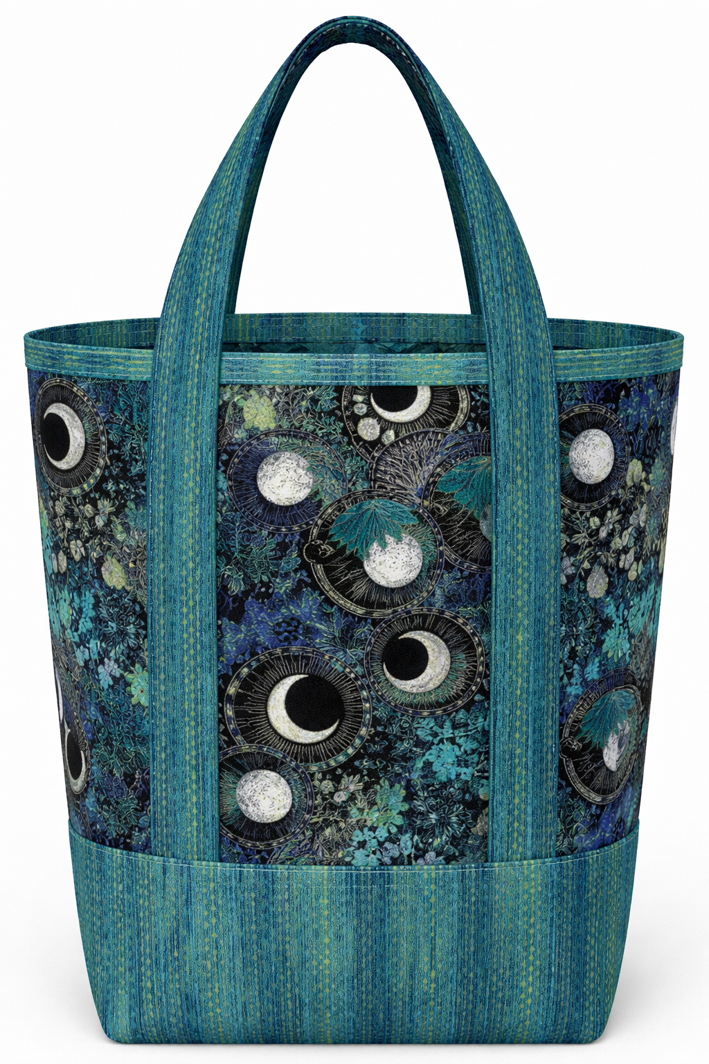 Grocery Bag Kit from the La Luna collection by Jason Yenter features dramatic celestial prints in rich sapphire, teal, black, and silver tones, designed to create a bold and practical everyday tote. Showcasing striking moonlit artwork paired with coordinating handles and lining, this bag combines night-sky elegance with functionality, making it perfect for market trips, library visits, or statement sewing projects.