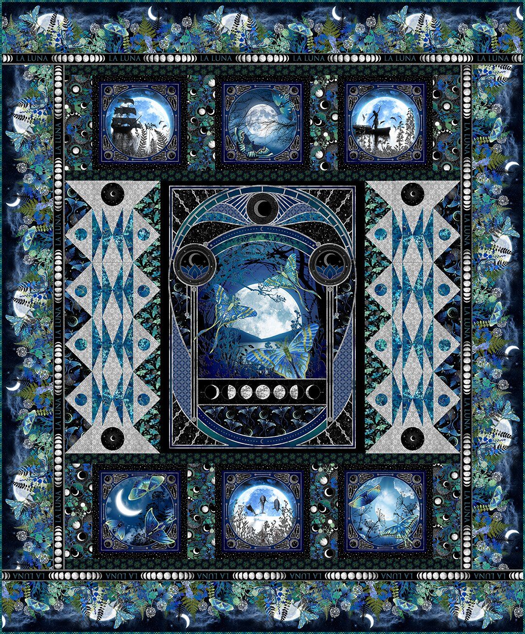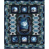 Quilt Kit from the La Luna collection by Jason Yenter creates a dramatic 77" x 83" quilt showcasing the collection’s striking moonlit panels and coordinating celestial prints in rich sapphire, teal, black, and silver tones. Designed to highlight the depth, contrast, and luminous artwork of the range, this kit delivers a bold centrepiece quilt filled with layered moons, intricate detailing, and captivating night-sky beauty.