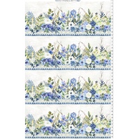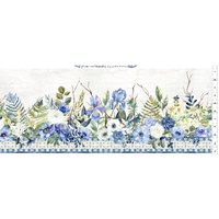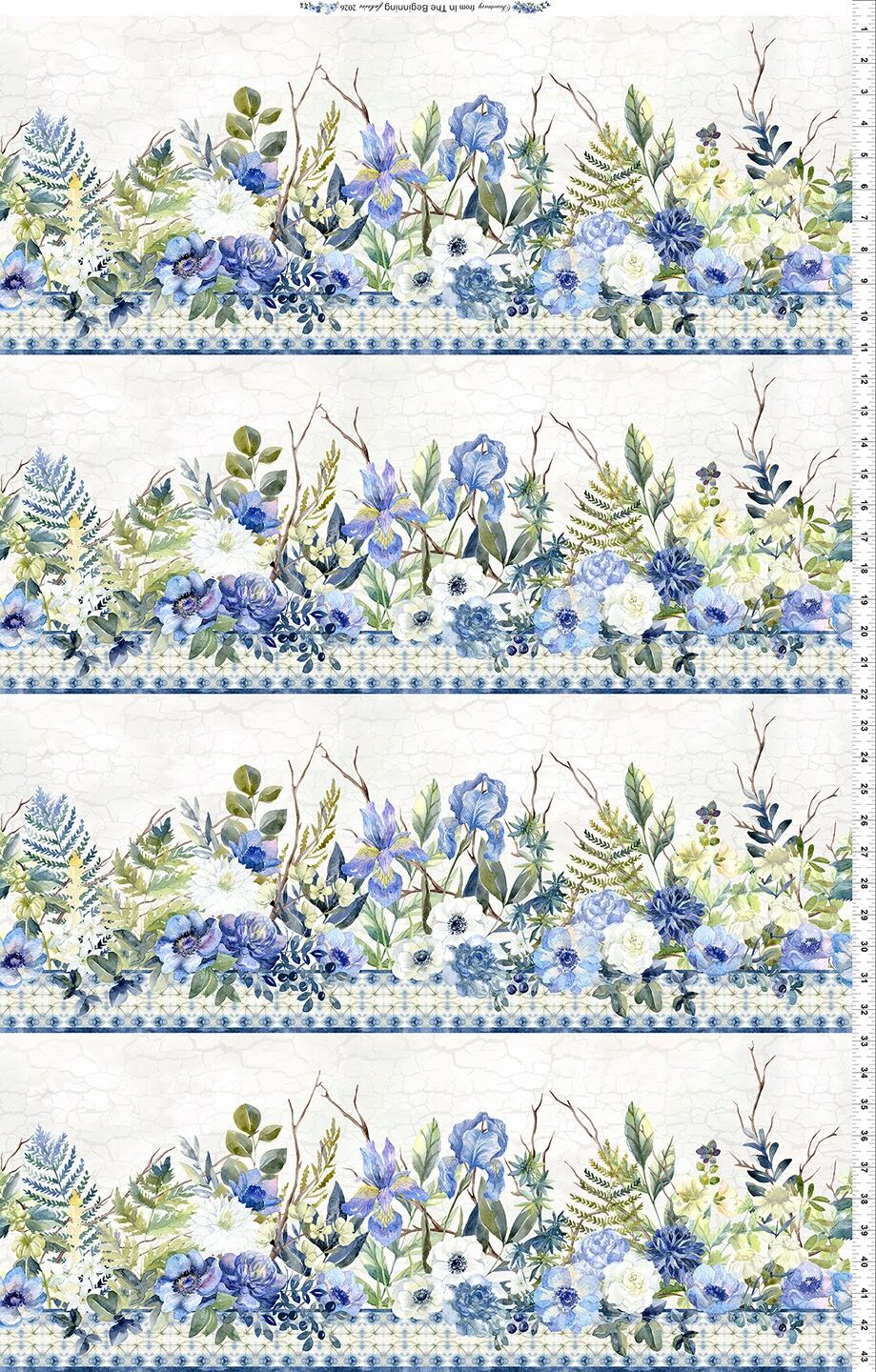Cream Border from the Sanctuary collection by Jason Yenter for In the Beginning Fabrics features a decorative floral border design with blue blossoms arranged along a geometric stripe.