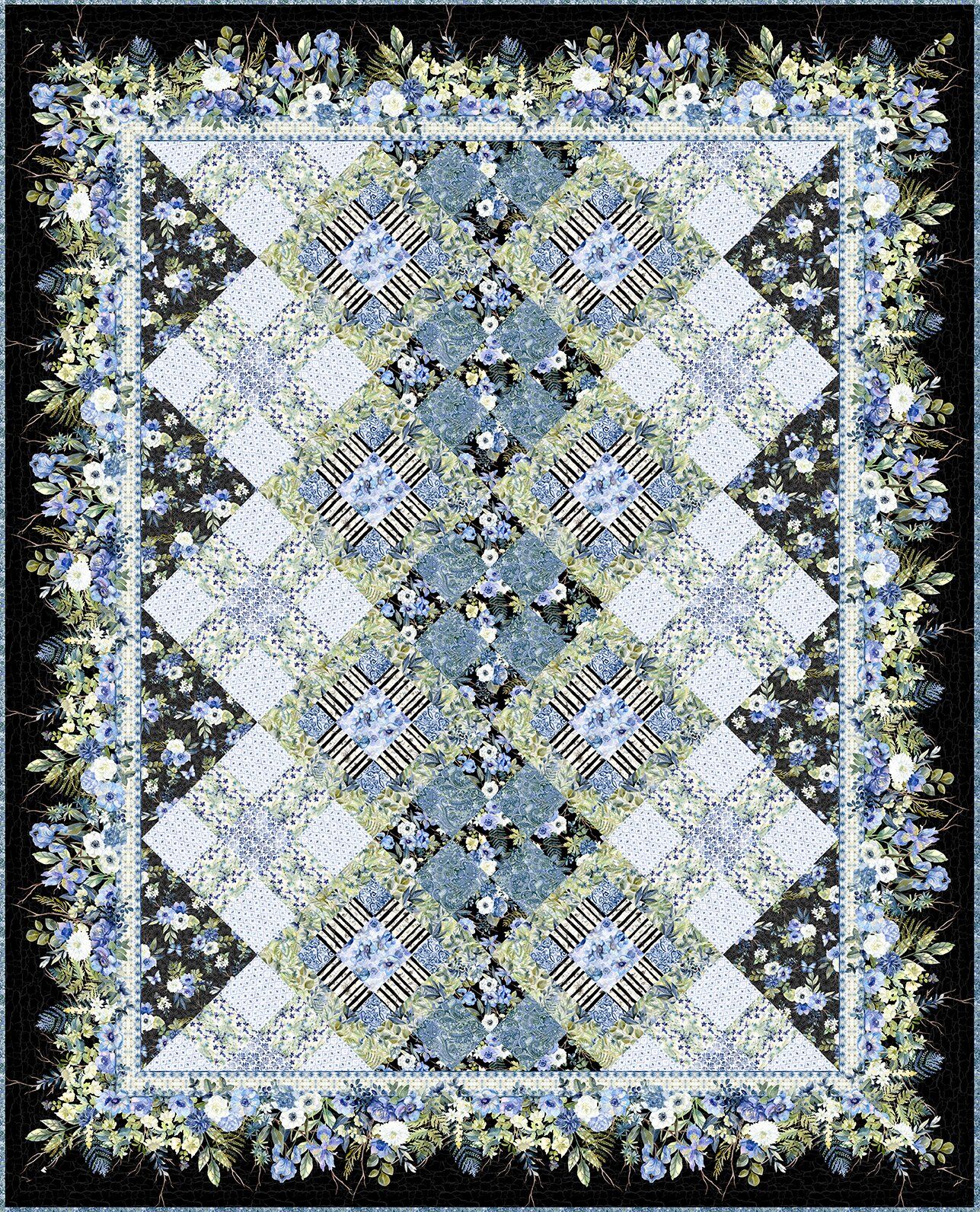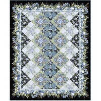 Sanctuary Quilt Kit – Black Colourway designed using the Sanctuary fabric collection by Jason Yenter for In the Beginning Fabrics. This dramatic quilt features a patchwork layout of coordinating floral, botanical and decorative prints in soft shades of blue, periwinkle and green set against a deep black background. The design is framed with an elegant floral border that highlights the delicate garden inspired artwork throughout the collection.