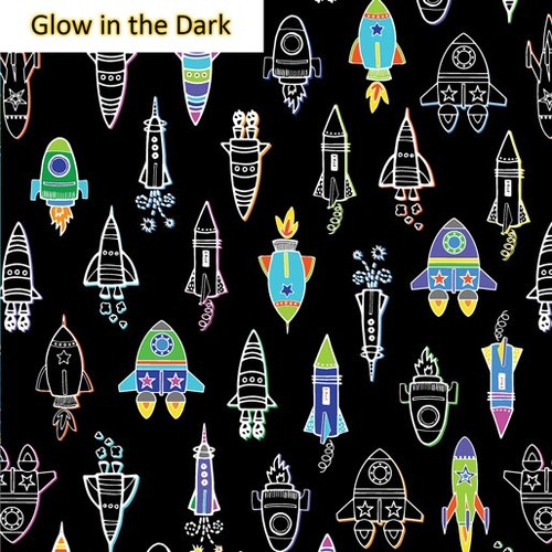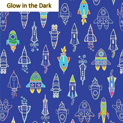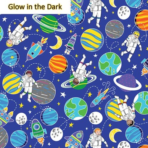Here is your chance to “Lift Off” into outer space while keeping your feet firmly planted on earth! This fun collection features vibrant space themed prints from astronauts and rockets to planets, constellations and stars, and they all glow in the dark.