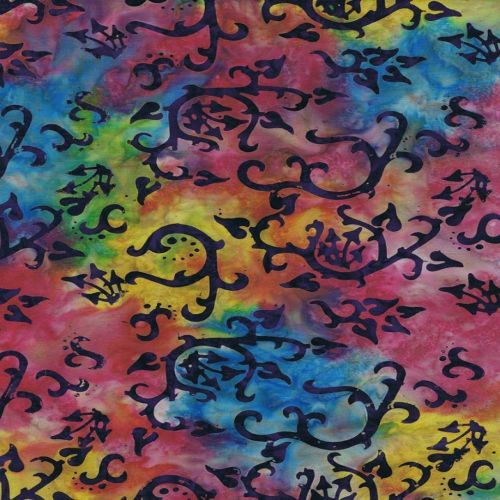 Magic Garden batik fabric by Kennard and Kennard features scrolls in rainbow