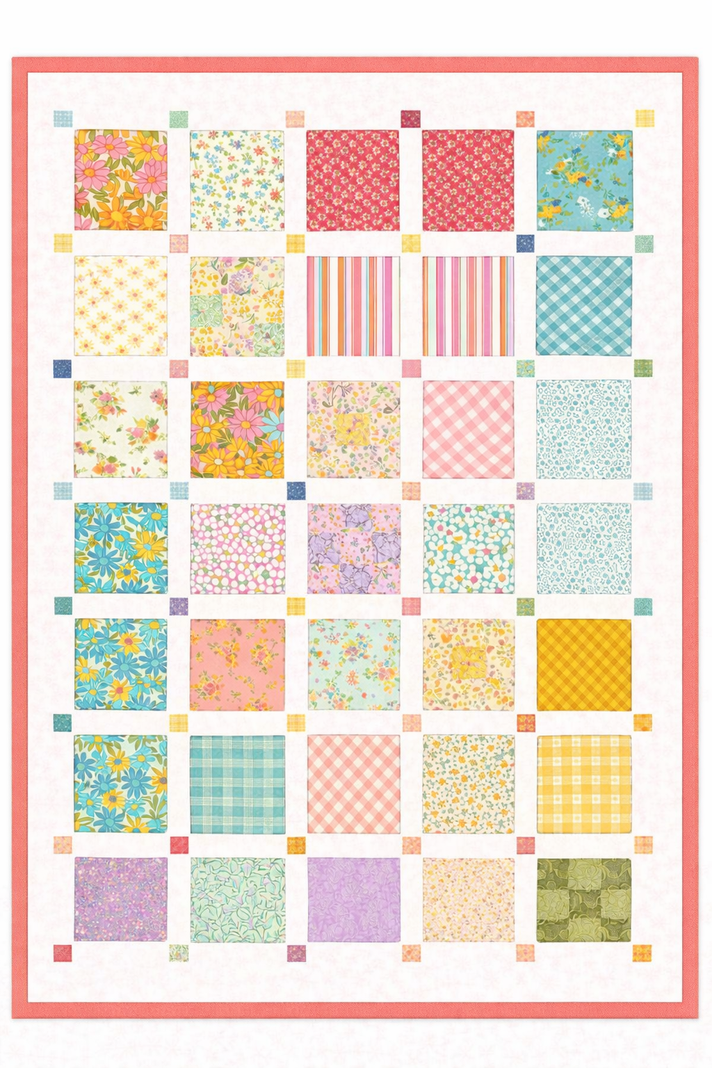 A Blooming Bunch by Maureen McCormick bursts with happy florals and retro-inspired colour. This quilt kit uses 10″ layer cake squares arranged in a clean grid, balanced with white sashing and colourful cornerstones. Perfect for brightening up your home or sewing a joyful gift quilt.