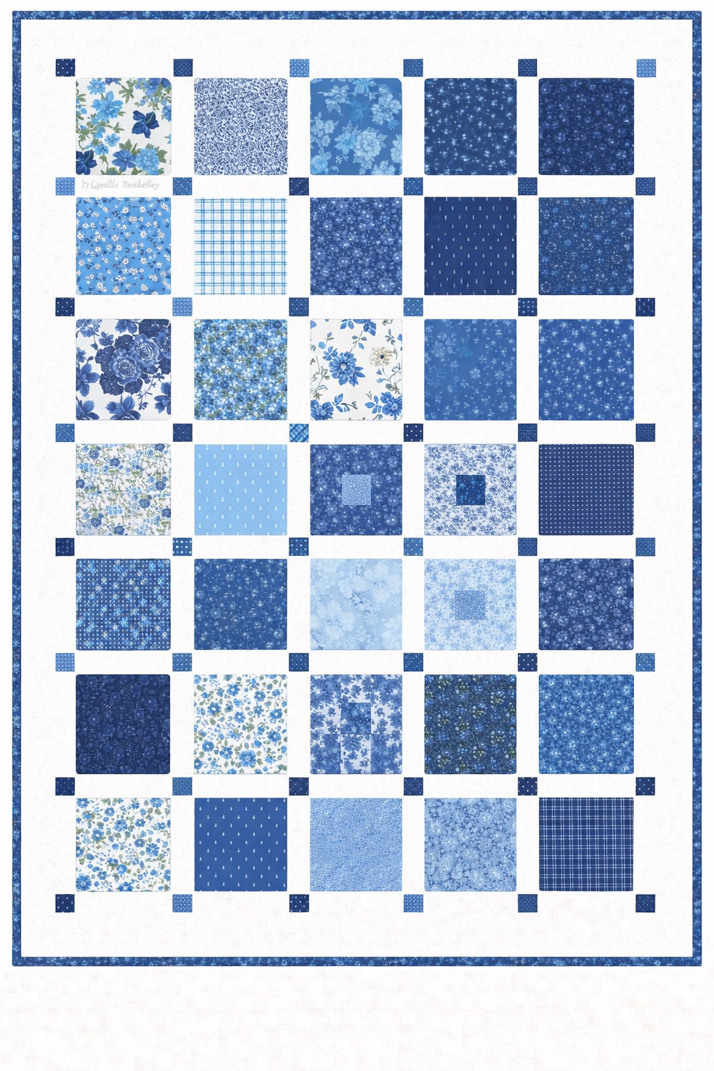 The Blueprint Quilt Kit by Camille Roskelley is a timeless blue-and-white quilt designed around 10″ layer cake squares. Featuring florals, dots, and geometrics, this quilt pairs beautifully with white sashing and a coordinating blue binding. A versatile design that suits both modern and traditional spaces.