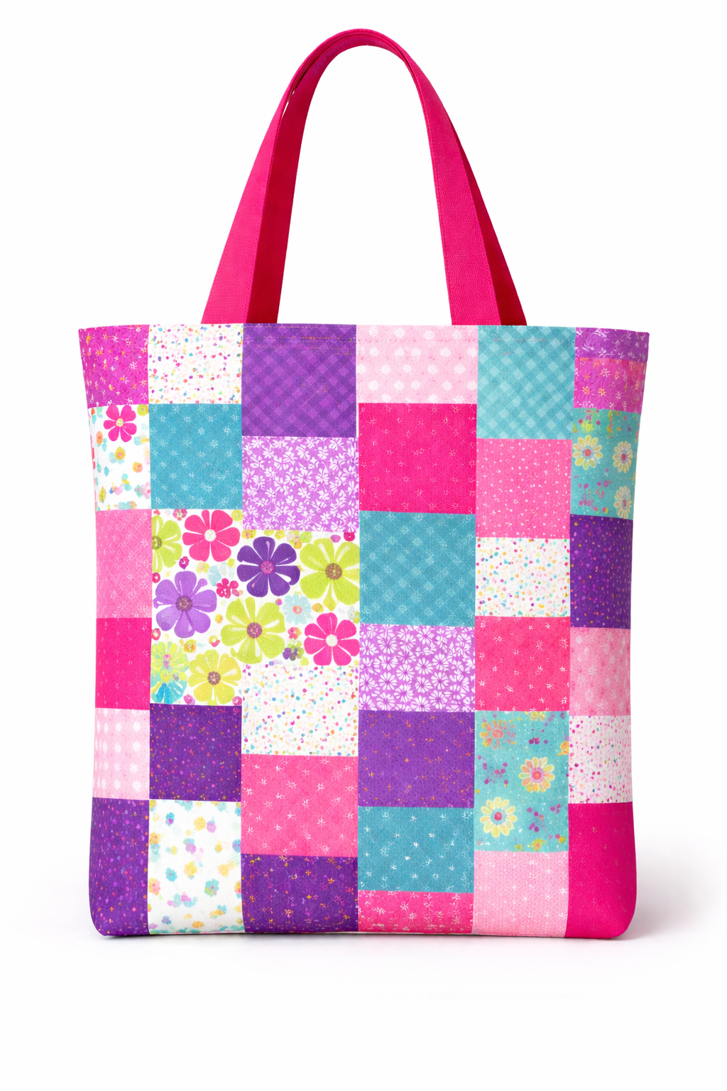 Bright, bold, and bursting with fun! This playful patchwork tote bag kit is made using the Pick Me! charm pack by Me & My Sister Designs for MODA — a joyful mix of quirky florals, spots, ginghams, and bright blenders in pinks, purples, turquoise and lime. A perfect stash-busting project or handmade gift idea.