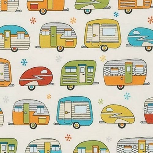 On the road caravans fabric by Robert Kaufman with metallic highlights on some of the vans roofs on a cream background