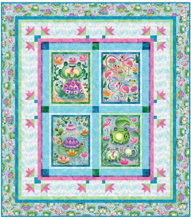 Sew a charming and colourful quilt with the Pondside Pals Quilt Kit from P & B Textiles. Featuring the whimsical Pondside Pals fabric collection by Jeremiah Ketner, this delightful quilt highlights playful frogs, turtles and flamingos surrounded by lily pads and cheerful pond flowers. Designed by Cyndi Hershey, the quilt combines sweet panel blocks with bright coordinating fabrics and borders that bring the whole design to life. The layout frames the adorable character panels with vibrant colours and playful prints from the collection, creating a quilt that feels lively, fun and full of personality. Perfect for a child’s room, lap quilt or special handmade gift, this design beautifully showcases the bright pond-inspired palette and whimsical artwork.