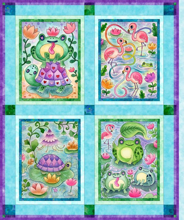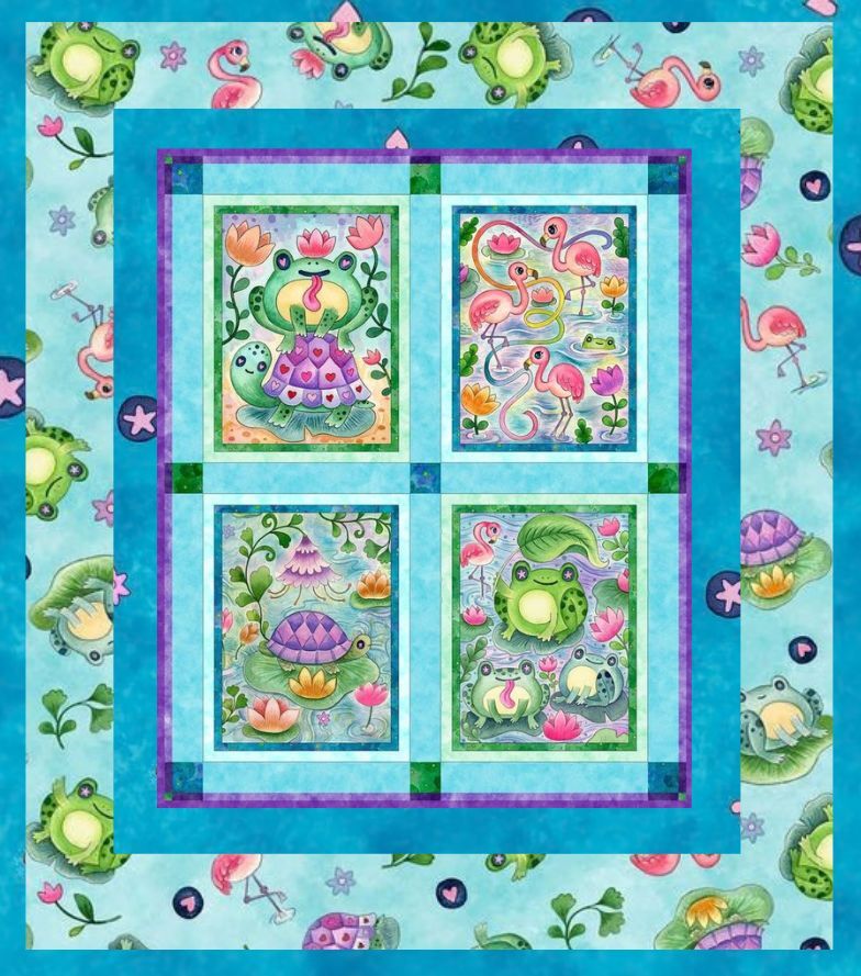 Create a cheerful children’s quilt with the Pondside Pals Panel Quilt Kit from P & B Textiles. This adorable kit features the sweet Pondside Pals characters including playful frogs, turtles and flamingos surrounded by lily pads, flowers and soft water textures. The panel blocks form the centre of the quilt, framed with coordinating fabrics from the collection to create a bright and whimsical finished project that is perfect for nursery quilts, children’s rooms or a fun gift for little ones. The soft aqua tones and playful pond-life illustrations bring the whole design together for a quilt that feels lively, colourful and full of character.