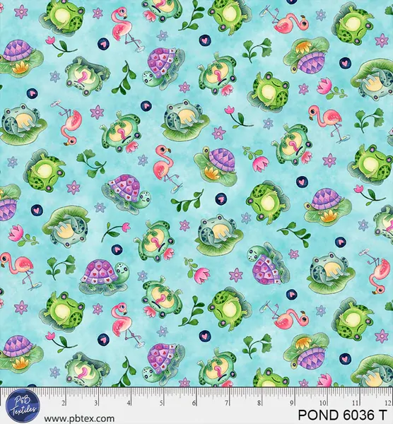 Bring cheerful pondside charm to your sewing projects with Tossed Pals Teal from the Pondside Pals collection by P & B Textiles. This delightful print features playful frogs, turtles and pink flamingos scattered among flowers and leafy sprigs across a fresh teal background, creating a lively and whimsical design full of personality. Perfect for quilts, nursery projects, children's sewing, bags, cushions and creative patchwork, this fun print captures the playful spirit of the Pondside Pals collection and coordinates beautifully with the other fabrics in the range.