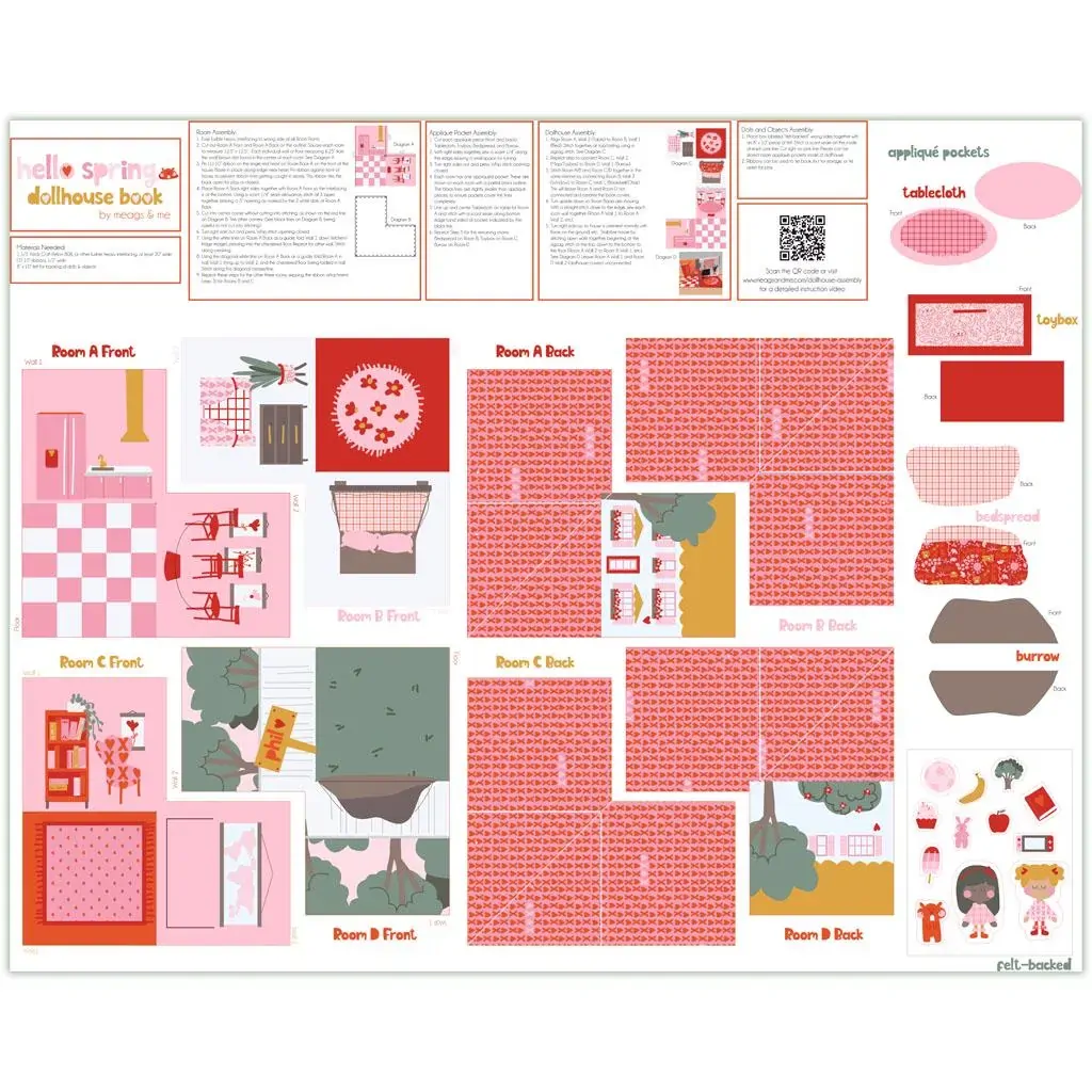 “Supplier Super Sale Special – limited quantities available once cut from the bolt.” This charming fabric panel is designed for crafting enthusiasts looking to create a delightful dollhouse setting. Featuring a 'Hello Spring' theme, the panel includes various elements like room backdrops, a tablecloth, and detailed scenes for a miniature home. The design is printed in soft pastel colors, predominantly pinks and greens, giving it a fresh, springtime feel. The fabric is perfect for those who enjoy sewing and crafting miniature scenes, providing a complete set to bring a small-scale springtime environment to life.