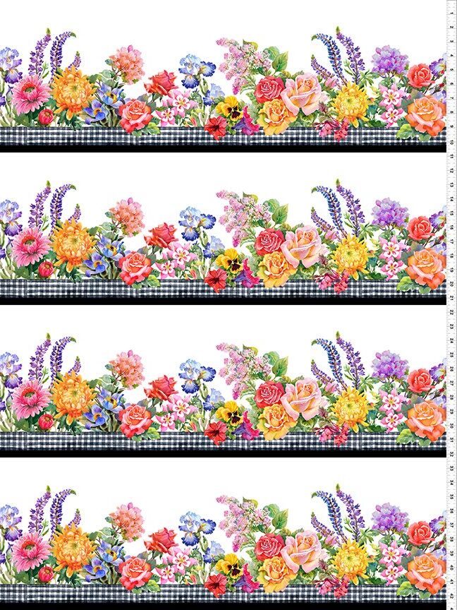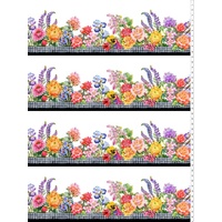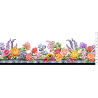 “Supplier Super Sale Special – limited quantities available once cut from the bolt.” Lush floral bouquets cascade in repeating border panels, framed with contrasting accents to create a bold and structured design. Perfect for statement quilt borders, runners and projects that showcase colour and movement.